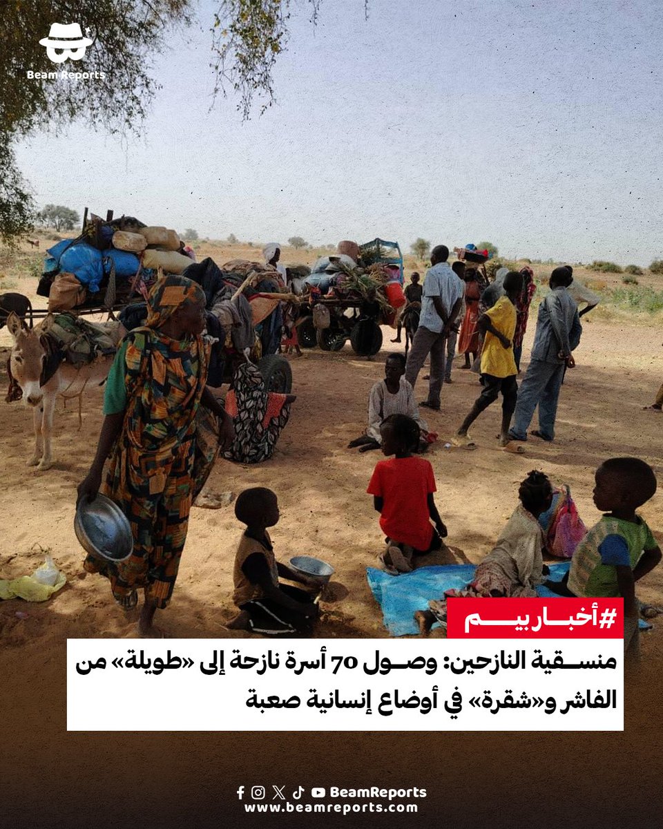 أعلنت منسقية النازحين واللاجئين عن وصول 70 أسرة نازحة إلى محلية «طويلة» أمس واليوم الجمعة، من الفاشر ومنطقة «شقرة» غرب المدينة ومخيم «زمزم». فيما أكد مصدر من المدينة لـ«بيم ريبورتس» تفاقم الأوضاع الإنسانية وارتفاع أسعار السلع الاستهلاكية ونقص المياه والأدوية وتوقف عدد من «التكايا» في المدينة بسبب نقص السلع الغذائية وأزمة السيولة النقدية.