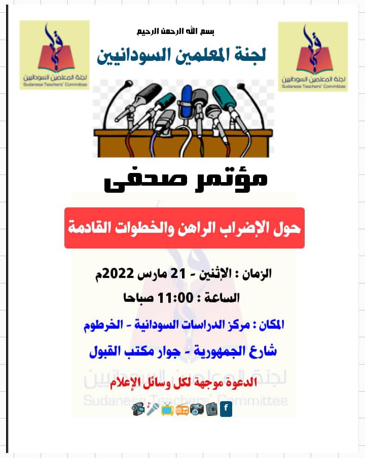 تدعوكم لجنة المعلمين السودانيين لحضور المؤتمر الصحفي حول الإضراب الراهن والخطوات القادمة
