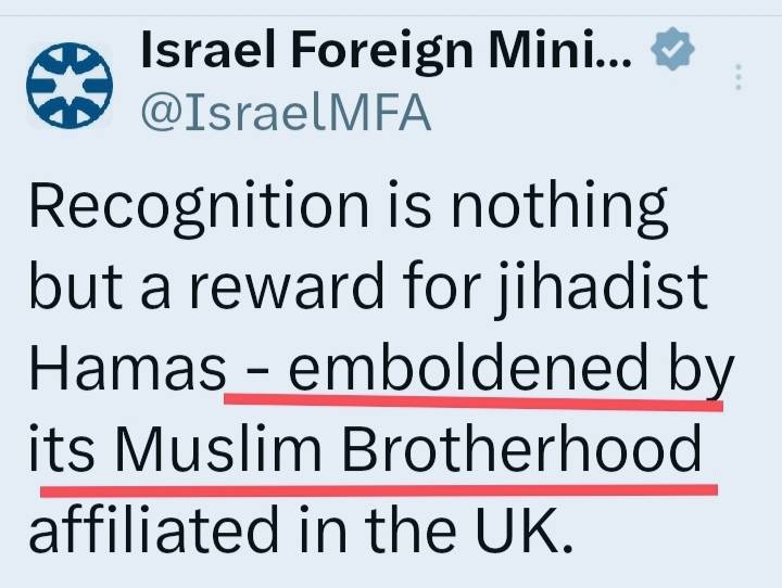 في البداية ظننته “تضليل اعلامي”: أن الخارجية الاسرائيلية قالت إن الاخوان المسلمين في بريطانيا هم من شجعوا بريطانيا على الاعتراف بالدولة الفلسطينية، لكن طلع خبر حقيقي. يعني من كل العالم والدول الأوربية، ترى اسرائيل أن القرار باطل لوجود دور للاخوان المسلمين في بريطانيا فيه حتى ولو بنسبة 1% وذلك لأن الاخوان المسلمين لو قالوا الماء العذب مفيد للصحة يجب عليك الهلاك عطشا أو تعتبر (كوز) لأن أي شيء يرضاه (الاسلاميين) هو إرهاب وشر. يبدو أن “فزاعة الاسلاميين” ليست “هيستيريا” قحت والمليشيا، وليست محصورة على السودان، هي فزاعة عالمية لسلب الحقوق وتهجير المواطنين ونزع أرضهم. وفي السودان تم استغلالها لذات الأمر ولذلك لن تستقيم الامور إلا بكسر هذه الفزاعة ومن يستخدمها ومن يستفيد منها.