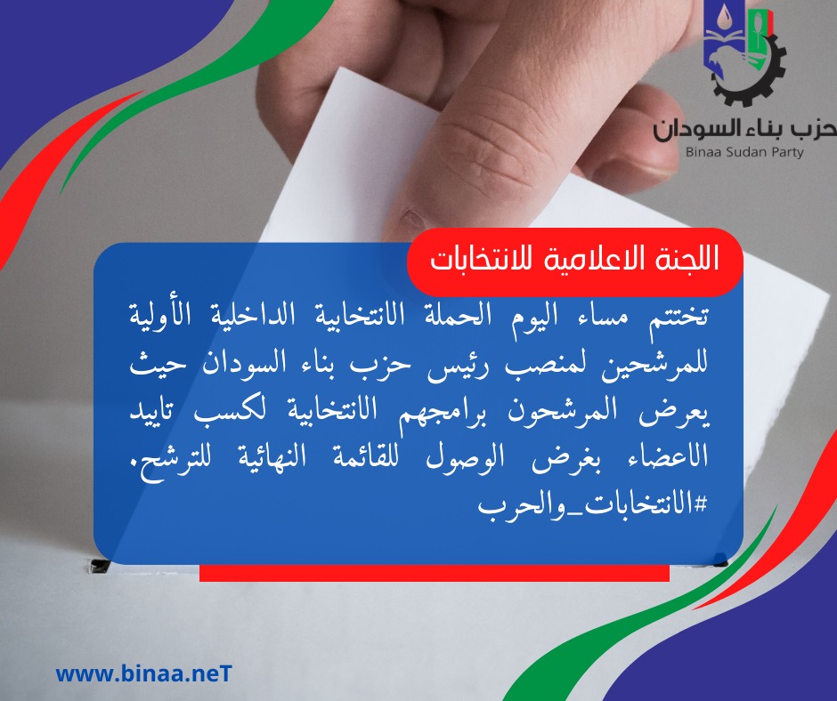 تختتم مساء اليوم الحملة الانتخابية الداخلية الأولية للمرشحين لمنصب رئيس حزب بناء السودان حيث يعرض المرشحون برامجهم الانتخابية لكسب تاييد الاعضاء بغرض الوصول للقائمة النهائية للترشح.