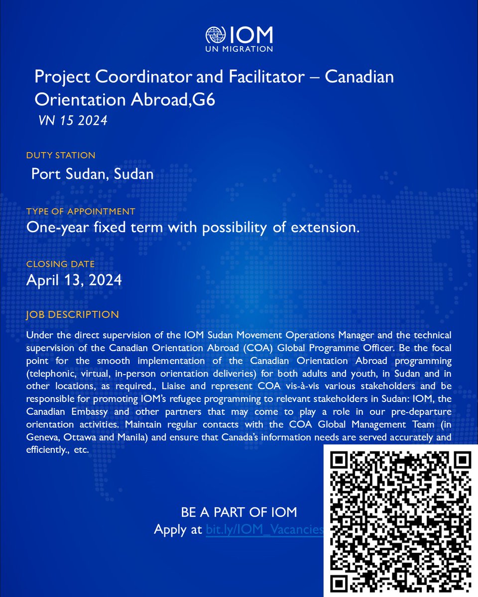 IOM is looking for a Project Coordinator and Facilitator – Canadian Orientation Abroad, in Port Sudan., Sudan.