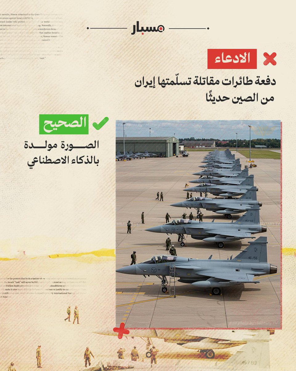🟡 نُشرت الصورة للمرة الأولى، في الرابع أغسطس من العام الجاري، عبر صفحة “Military Tv” على فيسبوك، وتضمنت مؤشرات على كونها مولدة بالذكاء الاصطناعي، من بينها تشوهات وعدم تناسق في الأرقام والشعارات التي تحملها الطائرات.