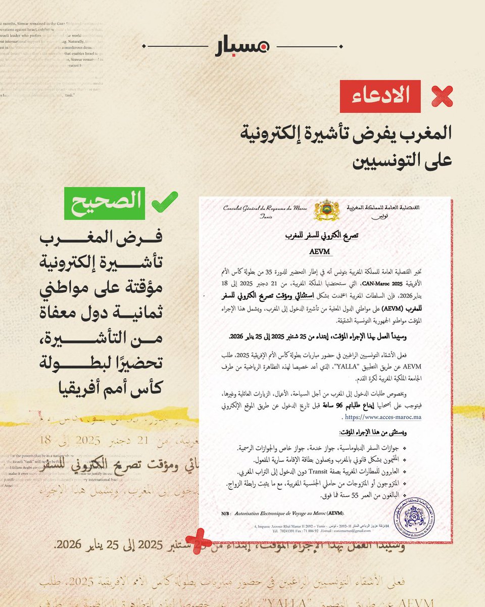 🔴 أعلن المغرب فرض تأشيرة إلكترونية على رعايا ثمانية دول معفاة عادة من التأشيرة، هي الجزائر وتونس وبوركينا فاسو والرأس الأخضر والغابون والنيجر والسنغال والطوغو، وذلك في إطار تحضيره لاستقبال جماهير بطولة كأس أمم أفريقيا، التي يستضيفها بين 21 ديسمبر 2025 و17 يناير 2026.
