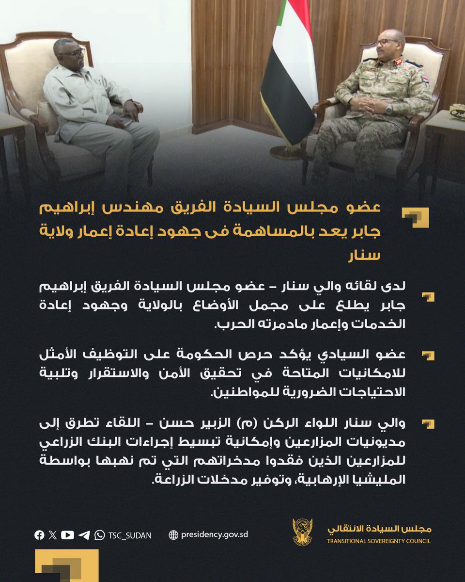 مجلس السيادة عضو مجلس السيادة الفريق مهندس إبراهيم جابر يعد بالمساهمة فى جهود إعادة إعمار ول… By null Published September 24, 2025 Share SHARE Facebook Twitter Pinterest LinkedIn[ad_1] ⭕️ عضو مجلس السيادة الفريق مهندس إبراهيم جابر يعد بالمساهمة فى جهود إعادة إعمار ولاية سنار بورتسودان ٢٧-٢-٢٠٢٥م [ad_2] Source by مجلس السيادة الإنتقالي – السودان Facebook Twitter Pinterest LinkedIn Share This Article Facebook Twitter Email Print Previous Article اكدت لممثلة الاتحاد الاوروبي بأن الحكومة السودانية تقف في خندق السلام، والسلام س… Next Article في 30 أكتوبر 1995، شهدت مقاطعة كيبيك الناطقة بالفرنسية استفتاءً حاسمًا للانفصال … Leave a Comment Leave a Reply Cancel replyYour email address will not be published. Required fields are marked *Comment * Name * Email * Website Save my name, email, and website in this browser for the next time I comment. Δ SearchSearchRecent Postsأكرمنا الله صباح اليوم الأحد بلقاء إخوةٍ كرام، على ضفة النيل الأزرق، حيث شاي الش… أعلن بنك السودان المركزي في منشور إدارة السياسات رقم (2025/15) رفع الاحتكار عن ا… ندوة بعنوان: القانون الدولي والسيادة الوطنية قراءة في موقف السودان من لجنة تقصي … والي نهر النيل تستقبل وزير الموارد البشرية والرعاية الاجتماعية الوزير يشيد بالأ… كامل ادريس: رئيس اللجنة السياسية لمؤسسات الدولة السودانية. Recent CommentsNo comments to show.