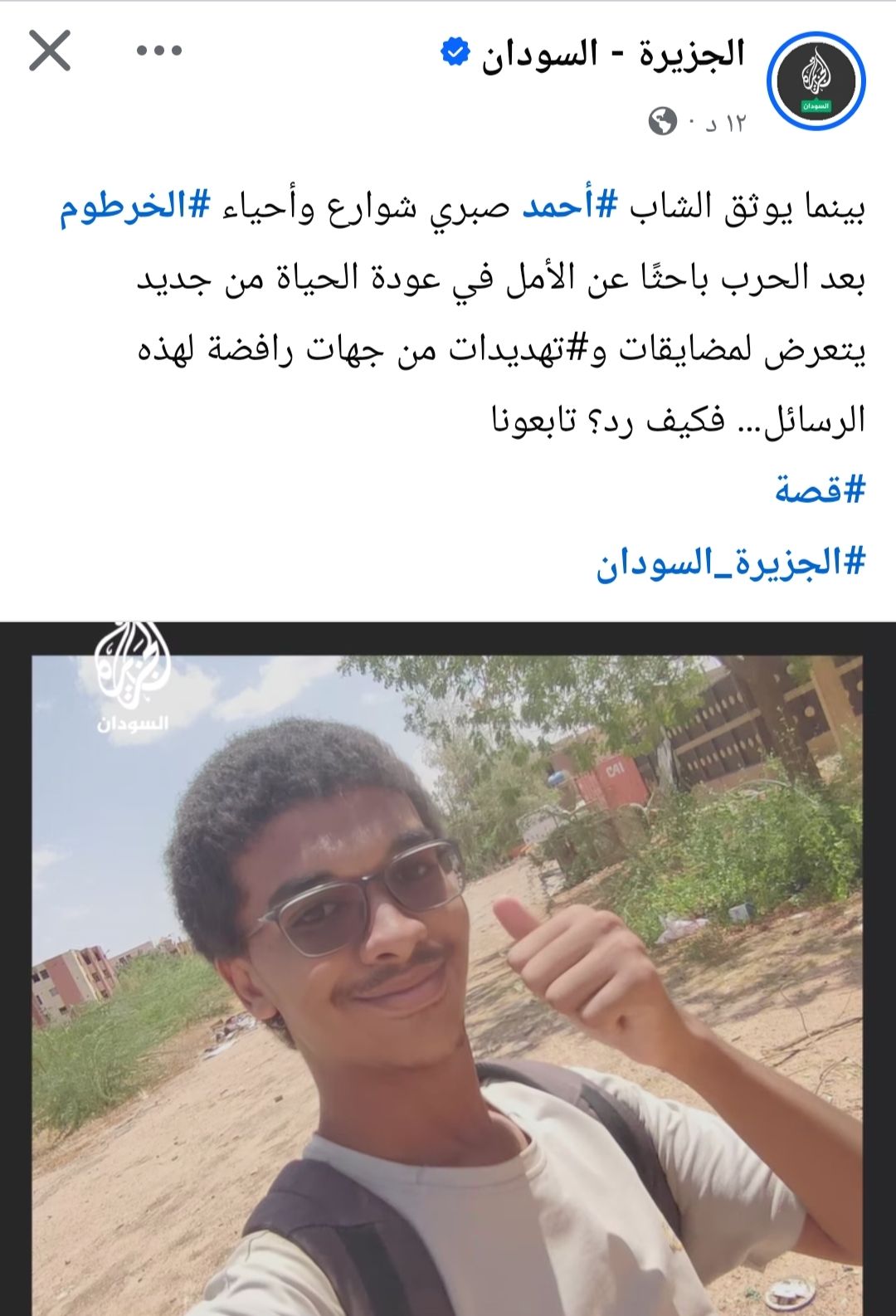 التهديدات التي يتعرض لها هذا الشاب المجد والمجتهد بتوريك إلى مدى بأن هنالك من يعمل على منع الناس من العودة، تارة بالشائعات، وتارة بتضخيم الأخبار السالبة، وهو مخطط خبيث يعمل بالتوازي مع عدوان الجنـ.جويد، وسعى منذ اليوم من الأول لتفريغ الأرض من سكانها، وإجبار الناس على النزوح، وخلق مأساة إنسانية، شاهدنا كيف تاجرت فيها حاضنة المليشيا السياسية. لذلك، فإن جهود أحمد صبري، الذي يستخدم هاتفه وحساب على فيسبوك لربط الناس ببيوتهم ومحلاتهم والتأكيد على ما يستحق الحياة والتشبث بالأمل، هى مجهودات مزعجة لفصيل سياسي بلا أخلاق، يسعى لترسيخ حالة من اليأس وعدم الاستقرار.