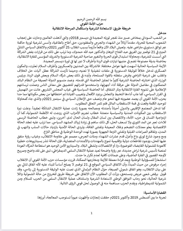 حزب الامة القومي خريطة طريق لاستعادة الشرعية واستكمال المرحلة الانتقالية، المقدمة من حزب الامة ال… By null Published September 25, 2025 Share SHARE Facebook Twitter Pinterest LinkedIn[ad_1] خريطة طريق لاستعادة الشرعية واستكمال المرحلة الانتقالية، المقدمة من حزب الامة القومي. [ad_2] Source by حزب الأمة القومي Facebook Twitter Pinterest LinkedIn Share This Article Facebook Twitter Email Print Previous Article Book Launch تدشين كتابنا منهج التحليل الثقافي: فشل مشروع الحداثة في السودان وتحد… Next Article الجدير بالذكر انه تم تصديق بالضمان العادي للاستاذ وجدي منذ الخميس الماضي 27/10/2… Leave a Comment Leave a Reply Cancel replyYour email address will not be published. Required fields are marked *Comment * Name * Email * Website Save my name, email, and website in this browser for the next time I comment. Δ SearchSearchRecent Postsأكرمنا الله صباح اليوم الأحد بلقاء إخوةٍ كرام، على ضفة النيل الأزرق، حيث شاي الش… أعلن بنك السودان المركزي في منشور إدارة السياسات رقم (2025/15) رفع الاحتكار عن ا… ندوة بعنوان: القانون الدولي والسيادة الوطنية قراءة في موقف السودان من لجنة تقصي … والي نهر النيل تستقبل وزير الموارد البشرية والرعاية الاجتماعية الوزير يشيد بالأ… كامل ادريس: رئيس اللجنة السياسية لمؤسسات الدولة السودانية. Recent CommentsNo comments to show.