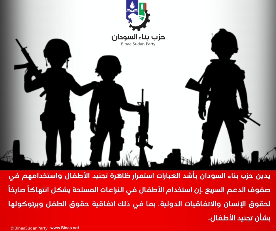 يدين حزب بناء السودان بأشد العبارات استمرار ظاهرة تجنيد الأطفال واستخدامهم في صفوف الدعم السريع والذي كان واضح وجلي في هجومهم الأمس 20 أغسطس 2023 على سلاح المدرعات بالخرطوم.