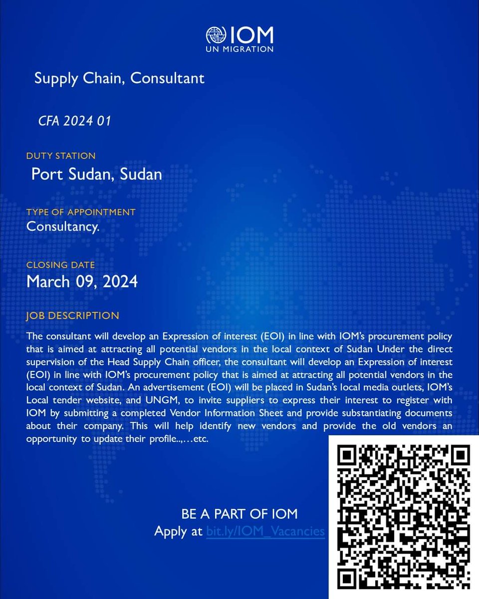 IOM is looking for a Supply Chain Consultant, in Port Sudan, Sudan.