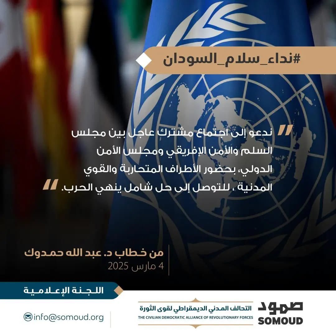 “ندعو لعقد اجتماع مشترك عاجل بين مجلس السلم والأمن الأفريقي ومجلس الأمن الدولي بحضور الأطراف المسلحة والقوي المدنية الديمقراطية ، للاتفاق علي هدنه إنسانية ، ووقف فوري وغير مشروط لإطلاق النار ، واتخاذ حزمة من الإجراءات لبناء الثقة وتهيئة المناخ لإنهاء الحرب .”