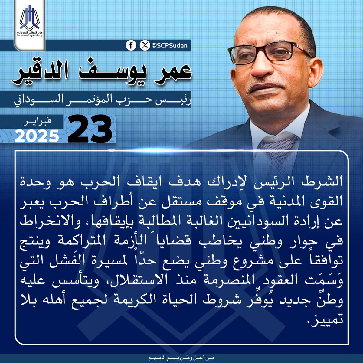 الشرط الرئيس لإدراك هدف ايقاف الحرب هو وحدة القوى المدنية في موقف مستقل عن أطراف الحرب يعبر عن إرادة السودانيين الغالبة المطالِبة بإيقافها، والانخراط في حوار وطني يخاطب قضايا الأزمة المتراكِمة وينتج توافقاً على مشروع وطني يضع حدّاً لمسيرة الفشل التي وَسَمَت العقود المنصرمة منذ الاستقلال، ويتأسس عليه وطنٌ جديد يُوفِّر شروط الحياة الكريمة لجميع أهله بلا تمييز.