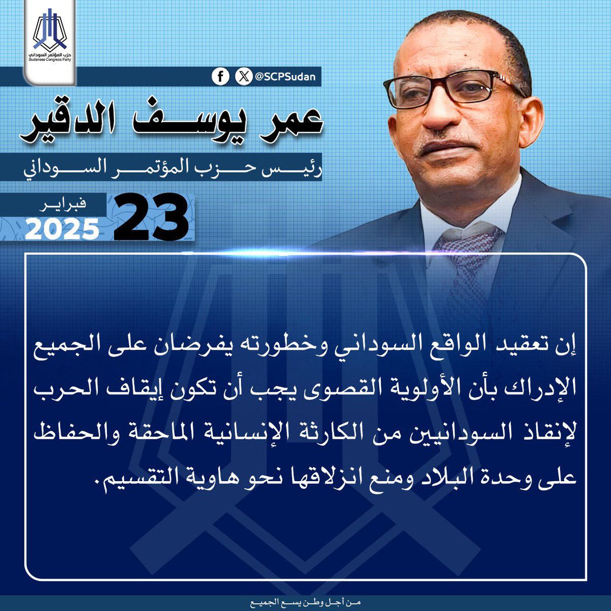 إن تعقيد الواقع السوداني وخطورته يفرضان على الجميع الإدراك بأن الأولوية القصوى يجب أن تكون إيقاف الحرب لإنقاذ السودانيين من الكارثة الإنسانية الماحقة والحفاظ على وحدة البلاد ومنع انزلاقها نحو هاوية التقسيم.