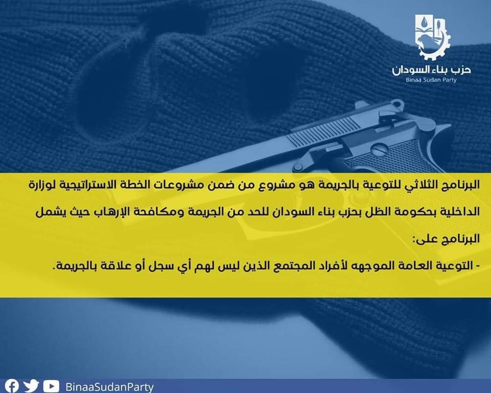 البرنامج الثلاثي للتوعية بالجريمة هو مشروع من ضمن مشروعات الخطة الاستراتيجية لوزارة الداخلية بحكومة الظل بحزب بناء السودان للحد من الجريمة ومكافحة الإرهاب حيث يشمل البرنامج على:
