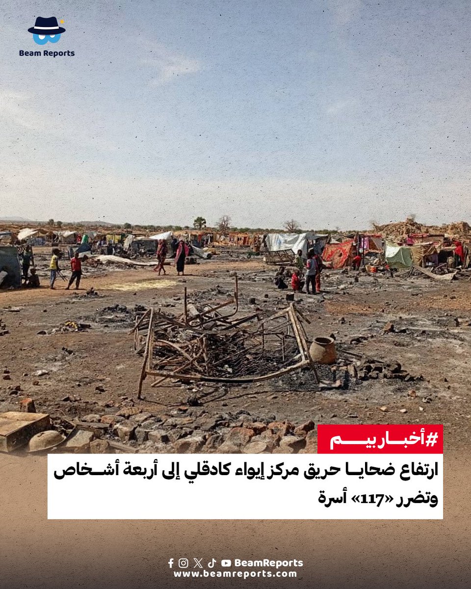 أكد عضو في غرفة طوارئ كادقلي لـ«بيم ريبورتس»، الثلاثاء، ارتفاع ضحايا حريق اندلع في مركز إيواء شمالي مدينة كادقلي عاصمة ولاية جنوب كردفان، يوم الجمعة، إلى أربعة أشخاص وإصابة 17 آخرين، مشيرًا إلى تضرر 117 أسرة وقال إن المتضررين يفتقدون لأبسط مقومات الحياة بعد دمار الموقع بالكامل.