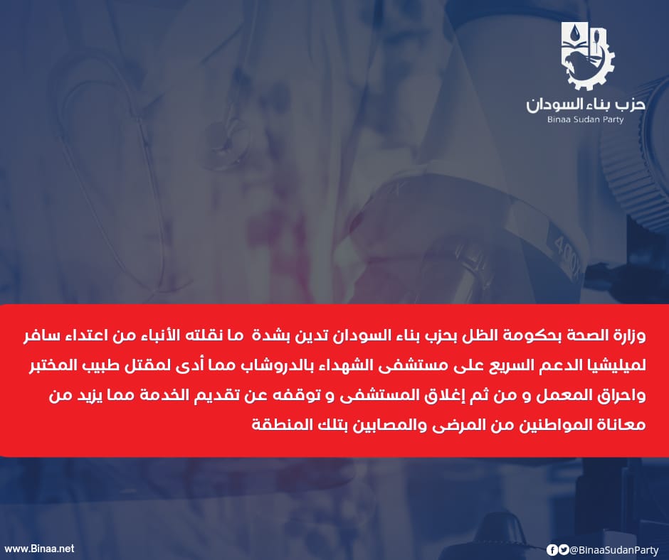 وزارة الصحة بحكومة ظل حزب بناء السودان تدين بشدة ما نقلته الأنباء عن اعتداء سافر لميليشيا الدعم السريع على مستشفى الشهداء بالدروشاب مما أدى لمقتل طبيب المختبر وإحراق المعمل ومن ثم إغلاق المستشفى وتوقفه عن تقديم الخدمة مما يزيد من معاناة المواطنين من المرضى والمصابين بتلك المنطقة