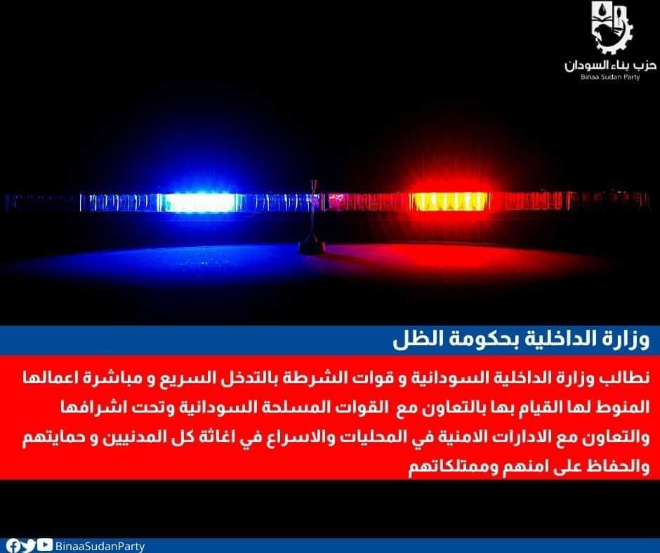 تدين وزارة الداخلية بحكومة ظل حزب بناء السودان كل العمليات العسكرية التي تجري داخل الأحياء السكنية