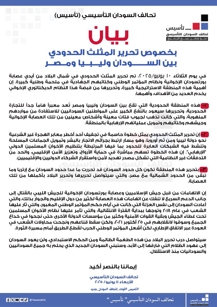 تحالف السودان التأسيسي تأسيس #بيان بخصوص تحرير المثلث الحدودي بين السودان وليبيا ومصر. … By null Published July 14, 2025 Share SHARE Facebook Twitter Pinterest LinkedIn[ad_1] #بيان بخصوص تحرير المثلث الحدودي بين السودان وليبيا ومصر. [ad_2] Source by تحالف السودان التأسيسي – (تأسيس) Facebook Twitter Pinterest LinkedIn Share This Article Facebook Twitter Email Print Previous Article الانقلاب وبناء دولتنا التي تسعنا جميعاً. نضم أصواتنا لدعوات لجان المقاومة بالدما… Next Article بسم الله الرحمن الرحيم حزب الأمة القومي الأمانة العامة تصريح صحفي حول تطورات ا… Leave a Comment Leave a Reply Cancel replyYour email address will not be published. Required fields are marked *Comment * Name * Email * Website Save my name, email, and website in this browser for the next time I comment. Δ SearchSearchRecent Postsأكرمنا الله صباح اليوم الأحد بلقاء إخوةٍ كرام، على ضفة النيل الأزرق، حيث شاي الش… أعلن بنك السودان المركزي في منشور إدارة السياسات رقم (2025/15) رفع الاحتكار عن ا… ندوة بعنوان: القانون الدولي والسيادة الوطنية قراءة في موقف السودان من لجنة تقصي … والي نهر النيل تستقبل وزير الموارد البشرية والرعاية الاجتماعية الوزير يشيد بالأ… كامل ادريس: رئيس اللجنة السياسية لمؤسسات الدولة السودانية. Recent CommentsNo comments to show.
