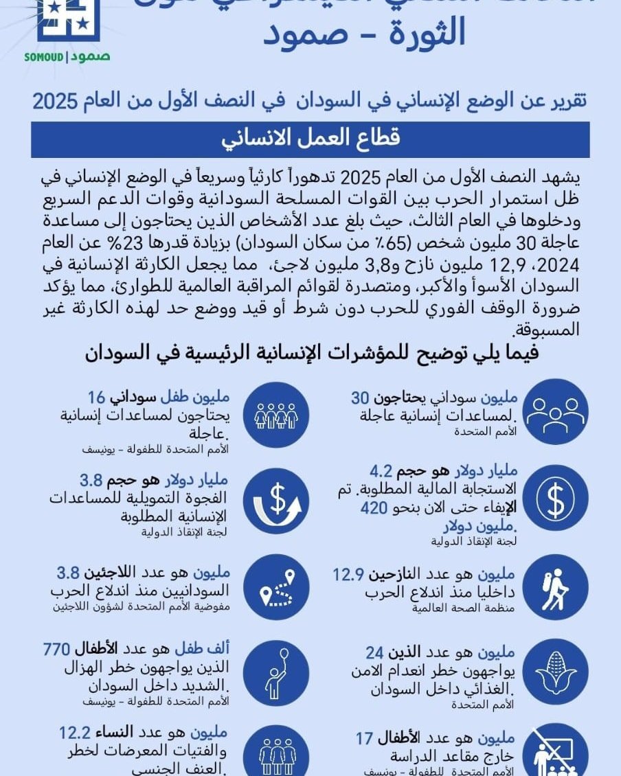يشهد النصف الأول من العام 2025 تدهوراً كارثياً وسريعاً في الوضع الإنساني في ظل استمرار الحرب بين القوات المسلحة السودانية وقوات الدعم السريع ودخولها في العام الثالث، حيث بلغ عدد الأشخاص الذين يحتاجون للمساعدة الإنسانية العاجلة 30 مليون شخص (65% من سكان السودان) بزيادة قدرها 23% عن العام 2024، 12,9 مليون نازح و3,8 مليون لاجئ، مما يجعل الكارثة الإنسانية في السودان الأسوأ والأكبر، ومتصدرة لقوائم المراقبة العالمية للطوارئ، مما يؤكد ضرورة الوقف الفوري للحرب دون شرط أو قيد ووضع حد لهذه الكارثة غير المسبوقة.