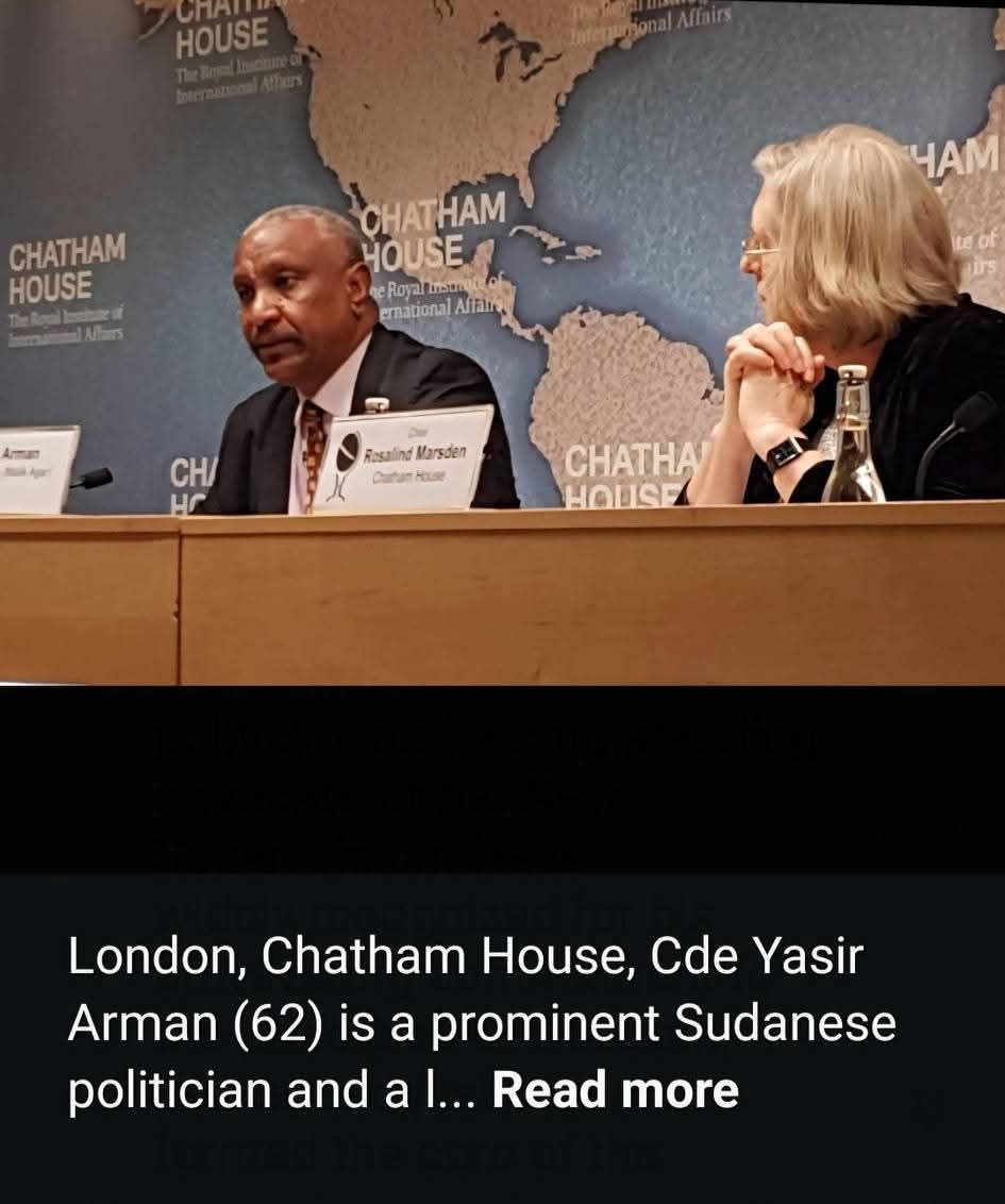 London, Chatham House, Cde Yasir Arman (62) is a prominent Sudanese politician and a long-standing advocate of the New Sudan vision. He is widely recognized for his unwavering commitment to the principles of freedom, peace, and justice, which formed the core of the December Revolution agenda. Arman has consistently voiced support for a democratic and inclusive Sudan, emphasizing the need for civilian rule, equal rights, and citizenship.
