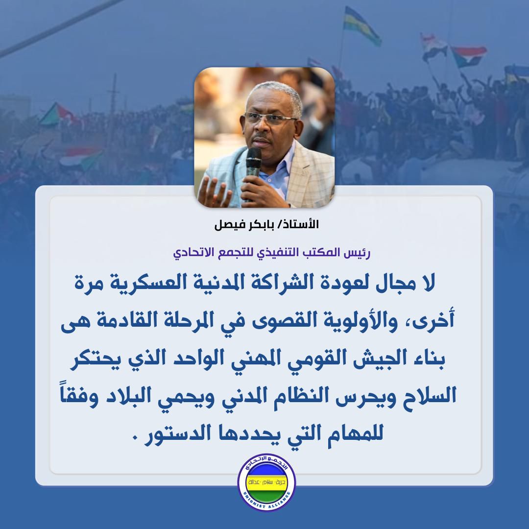 – لا مجال لعودة الشراكة المدنية العسكرية مرة أخرى, والأولوية القصوى في المرحلة القادمة هى بناء الجيش القومي المهني الواحد الذي يحتكر السلاح ويحرس النظام المدني ويحمي البلاد وفقاً للمهام التي يحددها الدستور .