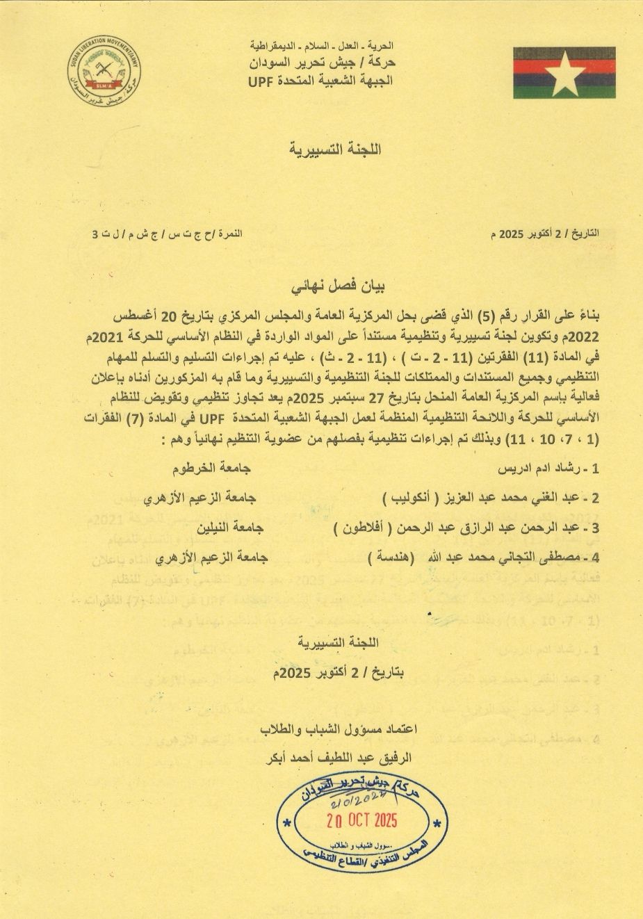 حركة جيش تحرير السودان بيان فصل نهائي من عضوية الجبهة الشعبية المتحدة (UPF) وحركة/ جيش تحرير السودان By null Published October 2, 2025 Share SHARE Facebook Twitter Pinterest LinkedIn 🛑بيان فصل نهائي من عضوية الجبهة الشعبية المتحدة (UPF) وحركة/ جيش تحرير السودان https://slma.net/?p=18046 Source Facebook Twitter Pinterest LinkedIn Share This Article Facebook Twitter Email Print Previous Article المبدع نهاد شاخور يكتب في رثاء الزعيم ود الياس: حليل الساس حبيب الناس عقد الماس … Next Article #التعليق_لكم وزير الإعلام خالد الإعيسر: كنت أحمل هاتفي داخل قاعة الجمعية العامة … Leave a Comment Leave a Reply Cancel replyYour email address will not be published. Required fields are marked *Comment * Name * Email * Website Save my name, email, and website in this browser for the next time I comment. Δ SearchSearchRecent Postsانفجارات تجيب الضهبان في نيالا #حكومة امكعوكات في حق الله إعلان مهم من مستشفى الأربعين التخصصي رجعة الأمل والعافية! بعد أكتر من سنة م… #الإدارة_المشتركة الإدارة المشتركة هي وظيفة هندسية حتمية لتطبيق بروتوكولات الإ… لن ننسي ولن نغفر مياه النيل تحاصر مدارس الصلوعاب بوادي خليل بمحلية المتمة بولاية نهر النيل #فيديو… Recent CommentsNo comments to show.