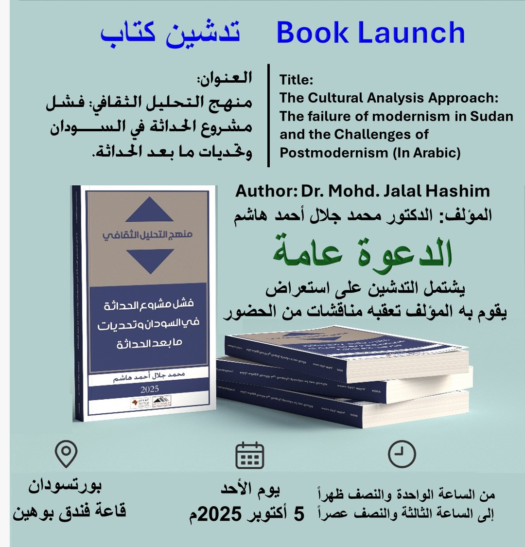محمد الامين تدشين كتاب : منهج التحليل الثقافي فشل مشروع الحداثة في السودان وتحديات ما بعد ال… By null Published October 4, 2025 Share SHARE Facebook Twitter Pinterest LinkedIn تدشين كتاب : منهج التحليل الثقافي فشل مشروع الحداثة في السودان وتحديات ما بعد الحداثة للدكتور: محمد جلال أحمد هاشم يوم الأحد 5/ أكتوبر بورتسودان قاعة فندق بوهين من الساعة الواحدة ظهرا للساعة الثالة والنصف عصرا Source Facebook Twitter Pinterest LinkedIn Share This Article Facebook Twitter Email Print Previous Article هذه الصورة إيام كام يجمعنا المؤتمر الشعبي كانت وقفة واعتصام أمام النيابة العام … Next Article ■ المليشي إدريس حسن (ثالث ثلاثة في رأس عصابة آل دقلو حميدتي.. النور قبة) حيث بدأ… Leave a Comment Leave a Reply Cancel replyYour email address will not be published. Required fields are marked *Comment * Name * Email * Website Save my name, email, and website in this browser for the next time I comment. Δ SearchSearchRecent Postsترمب رحّب وقال إن حماس مستعدة للسلام.. بريطانيا وفرنسا: قبول حماس خطوة مهمة.. وم… ■ المليشي إدريس حسن (ثالث ثلاثة في رأس عصابة آل دقلو حميدتي.. النور قبة) حيث بدأ… تدشين كتاب : منهج التحليل الثقافي فشل مشروع الحداثة في السودان وتحديات ما بعد ال… هذه الصورة إيام كام يجمعنا المؤتمر الشعبي كانت وقفة واعتصام أمام النيابة العام … اررىرح تسمع رواية معسكر ثلوووج والبل الحلال Recent CommentsNo comments to show.