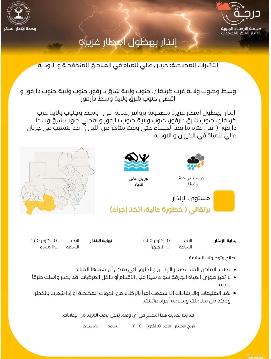 بورتسودان 5-10-2025 (سونا)- أصدرت الهيئة العامة للأرصاد الجوية اليوم إنذاراً باللون البرتقالي بخطورة عالية في كل من وسط وجنوب ولاية غرب كردفان، جنوب ولاية شرق دارفور، جنوب ولاية جنوب دارفور وأقصى جنوب شرق ولاية وسط دارفور، حيث يُتوقع هطول أمطار غزيرة مصحوبة بعواصف رعدية قد تتسبب في جريان عالي للمياه في المناطق المنخفضة والأودية، وقد أوضحت هيئة الأرصاد الجوية أن هذه الأمطار والعواصف الرعدية متوقعة اليوم الأحد الخامس من أكتوبر الساعة الثالثة بعد الظهيرة، وقدرت الهيئة أن هطول الأمطار قد يحدث في وقتٍ ما من مساء هذا اليوم الى الساعة الحادية عشرة من هذه الليلة.
