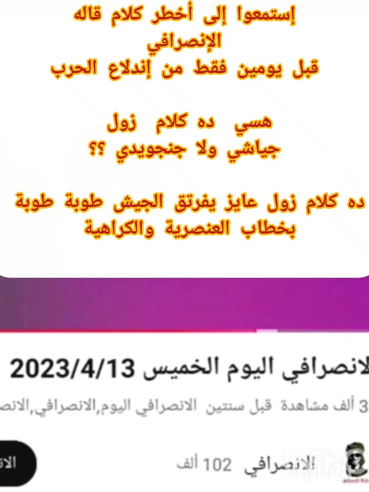 قلت ليكم إنو الزول ده بكره مجتمعات السودان، الكراهية الواحدة دي، قبل يومين من الحرب كان مستهدف الكباشي والنوبة، قبل يومين من الحرب كان بتكلم عن ناس دارفور في الجيش، الزول ده كان بفرتق في الجيش طوبه طوبه، لمصلحة منو الكلام ده كان 🙂