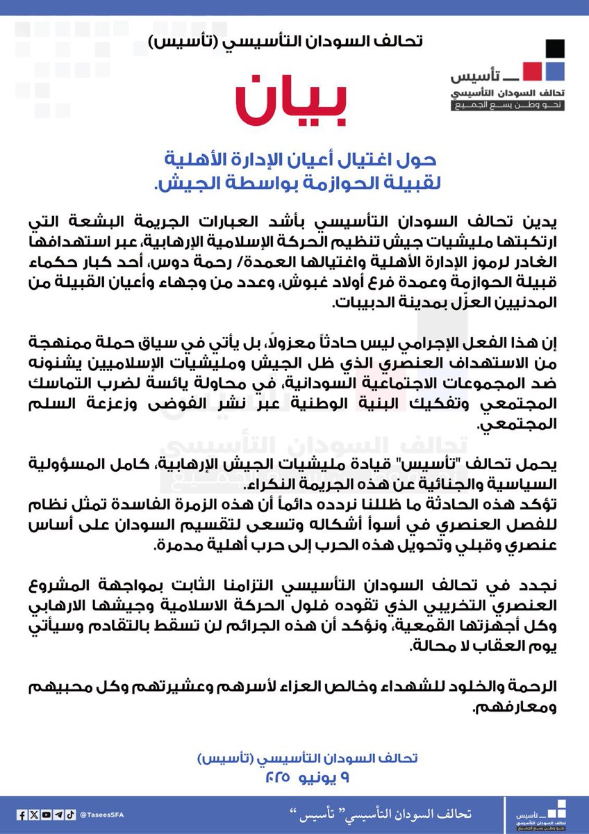 تحالف السودان التأسيسي تأسيس بيان حول اغتيال أعيان الإدارة الأهلية لقبيلة الحوازمة بواسطة الجيش. … By null Published July 15, 2025 Share SHARE Facebook Twitter Pinterest LinkedIn[ad_1] بيان حول اغتيال أعيان الإدارة الأهلية لقبيلة الحوازمة بواسطة الجيش. [ad_2] Source by تحالف السودان التأسيسي – (تأسيس) Facebook Twitter Pinterest LinkedIn Share This Article Facebook Twitter Email Print Previous Article الاصطفاف من أجل إقامة الوضع الدستوري الجديد، لأجل إقامة بديل يُحقق شعارات الثورة… Next Article بسم الله الرحمن الرحيم حزب الأمة القومي مجلس التنسيق بيان صحفي عقد مجلس التن… Leave a Comment Leave a Reply Cancel replyYour email address will not be published. Required fields are marked *Comment * Name * Email * Website Save my name, email, and website in this browser for the next time I comment. Δ SearchSearchRecent Postsأكرمنا الله صباح اليوم الأحد بلقاء إخوةٍ كرام، على ضفة النيل الأزرق، حيث شاي الش… أعلن بنك السودان المركزي في منشور إدارة السياسات رقم (2025/15) رفع الاحتكار عن ا… ندوة بعنوان: القانون الدولي والسيادة الوطنية قراءة في موقف السودان من لجنة تقصي … والي نهر النيل تستقبل وزير الموارد البشرية والرعاية الاجتماعية الوزير يشيد بالأ… كامل ادريس: رئيس اللجنة السياسية لمؤسسات الدولة السودانية. Recent CommentsNo comments to show.