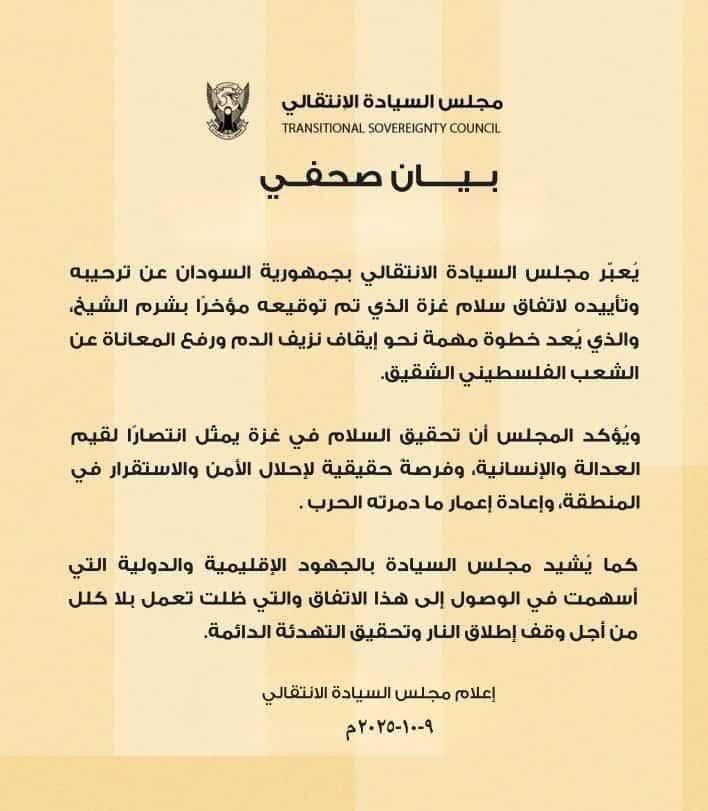 أصدرت سُلطة الأمر الواقع المُمثلة في مجلس السيادة الانتقالي بياناً مطوّلاً يرحّب فيه باتفاق “سلام غزّة”، ويصفه بالخطوة المهمة لوقف نزيف الدم ورفع المعاناة عن الشعب الفلسطيني. كلامٌ منمّق يفيض بالحديث عن العدالة والإنسانية، والفرصة لتحقيق الأمن والاستقرار، وإعادة الإعمار لما دمّرته الحرب.