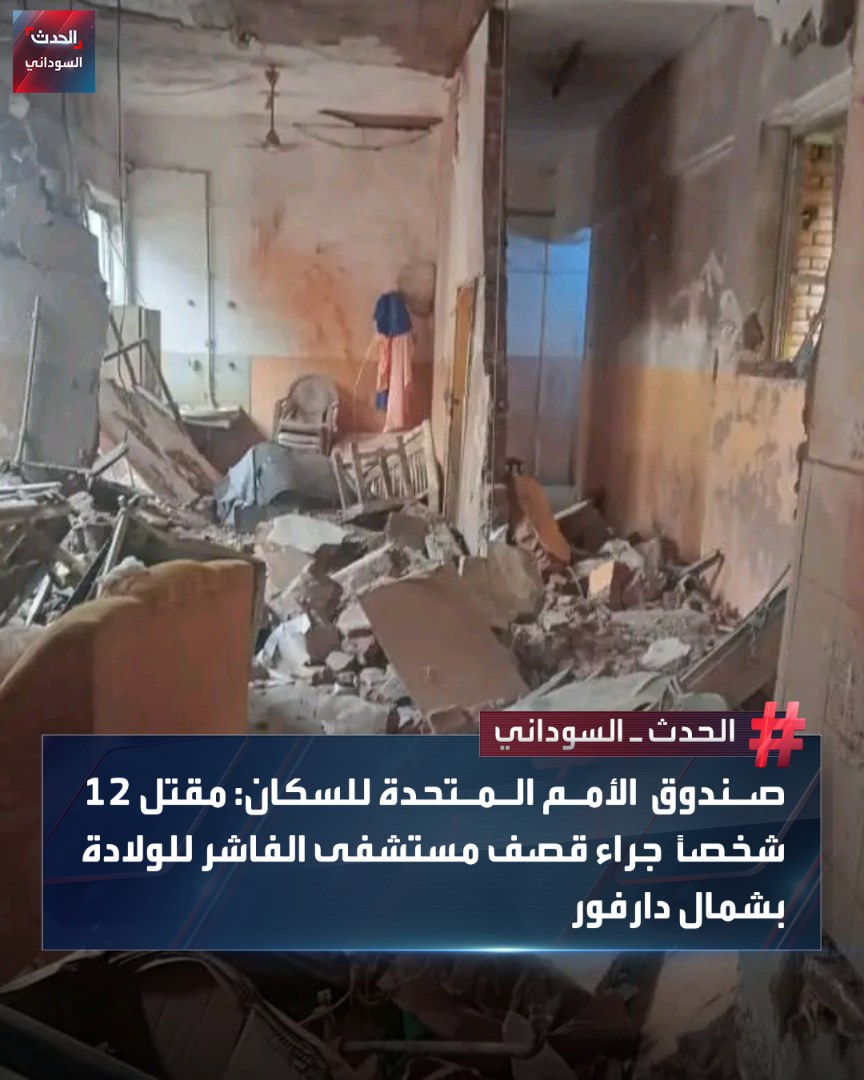 أعلن صندوق الأمم المتحدة للسكان عن مقتل 12 شخصًا، بينهم نساء وأطفال، بمستشفى الفاشر للولادة في شمال دارفور جراء تعرض المستشفى للقصف 4 مرات خلال أسبوع.