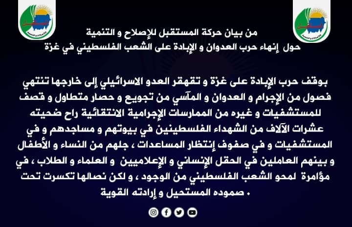 من بيان حركة المستقبل للإصلاح و التنمية حول إنهاء حرب العدوان و الإبادة على الشعب الفلسطيني في غزة