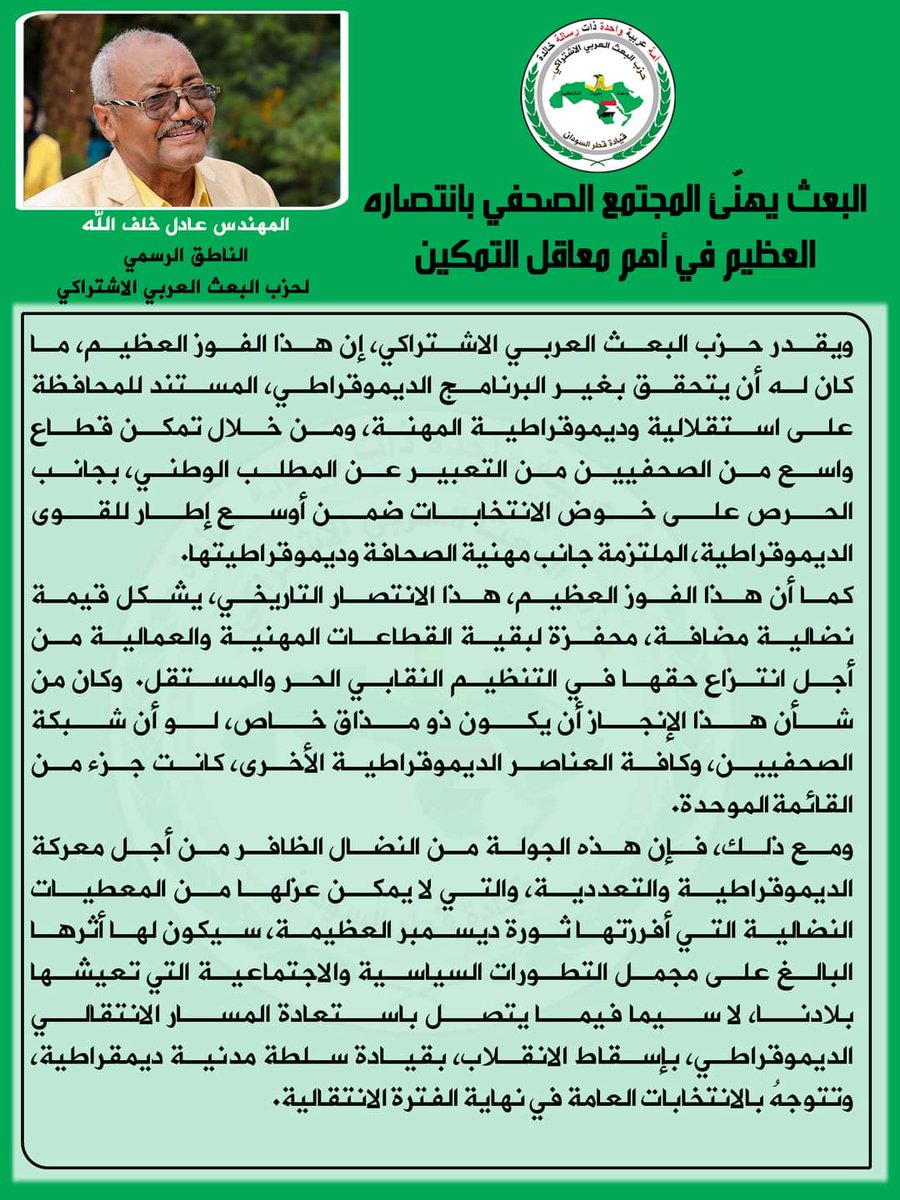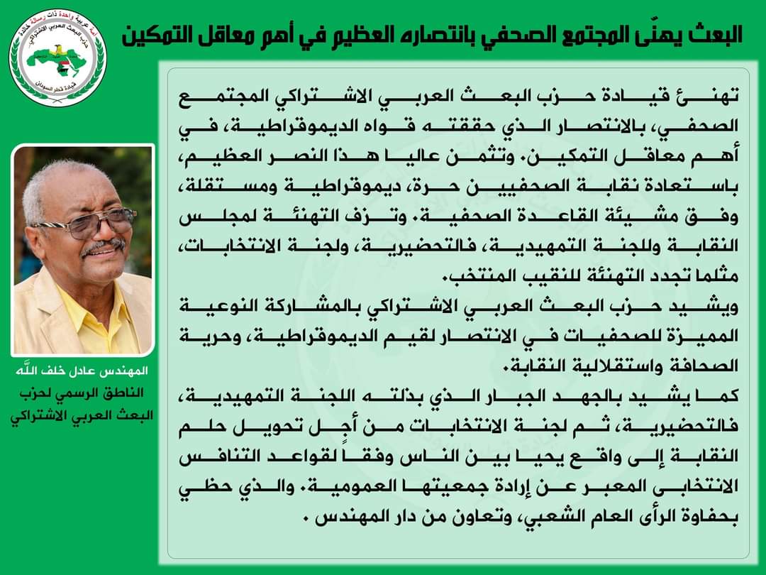 تهنئة قيادة قطر السودان لحزب البعث العربي الاشتراكي للمجتمع الصحفي بإنتظاره العظ…