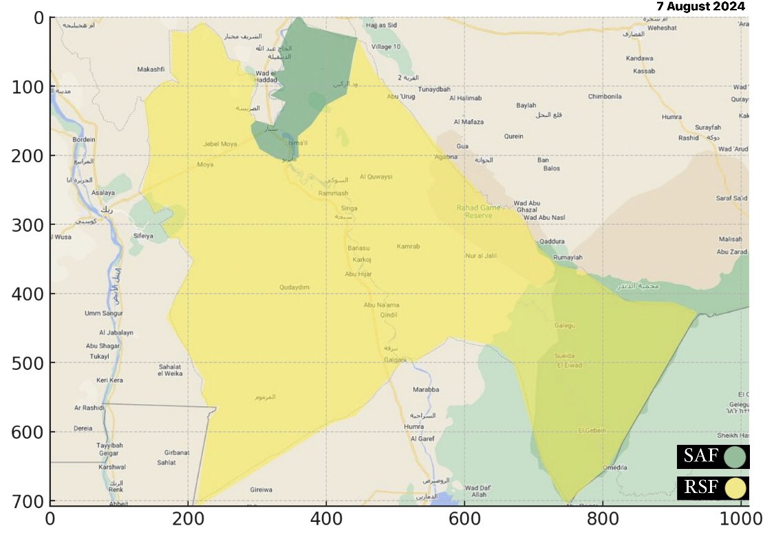 القوات المسلحة تكاد تسيطر على ١٠٪ من ولاية سنار بعد موجة كبيرة من الانسحابات التي لم تشهد مثلها الدولة السودانية، فإستطاعت مليشيات الدعم السريع ان تسيطر على مناطق واسعة جدا من الولاية منذ اول هجمة على جبل موية بتاريخ 23/6/2024 و حتى 25/7/2024 عندما سقطت مدينة السوكي.