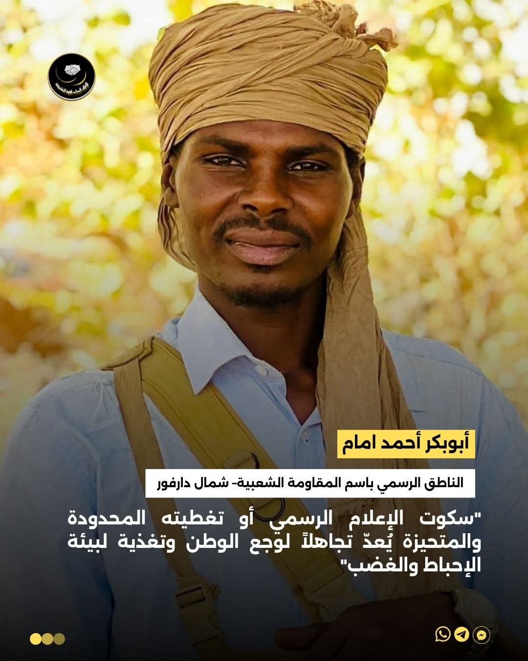 المتحدث الرسمي باسم المقاومة الشعبية بولاية شمال دارفور: “سكوت الإعلام الرسمي أو تغطيته المحدودة والمتحيزة يُعدّ تجاهلاً لوجع الوطن وتغذية لبيئة الإحباط والغضب”.