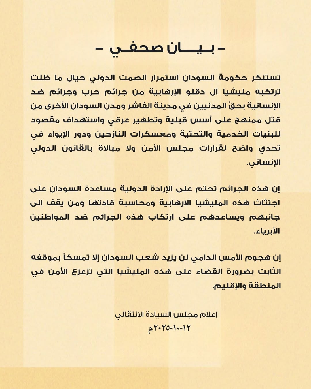 تستنكر حكومة السودان استمرار الصمت الدولي حيال ما ظلت ترتكبه مليشيا آل دقلو الإرهابية من جرائم حرب وجرائم ضد الإنسانية بحقّ المدنيين في مدينة الفاشر ومدن السودان الأخرى من قتل ممنهج على أسس قبلية وتطهير عرقي واستهداف مقصود للبنيات الخدمية والتحتية ومعسكرات النازحين ودور الإيواء في تحدي واضح لقرارات مجلس الأمن ولا مبالاة بالقانون الدولي الإنساني.
