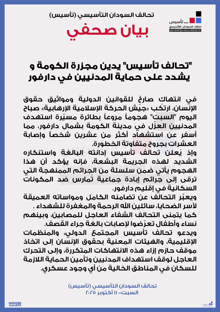 وإذ يُعلن تحالف تأسيس إدانته البالغة واستنكاره الشديد لهذه الجريمة البشعة، فإنه يؤكد أن هذا الهجوم يأتي ضمن سلسلة من الجرائم الممنهجة التي ترقى إلى جرائم إبادة جماعية تُمارس ضد المكونات السكانية في إقليم دارفور.