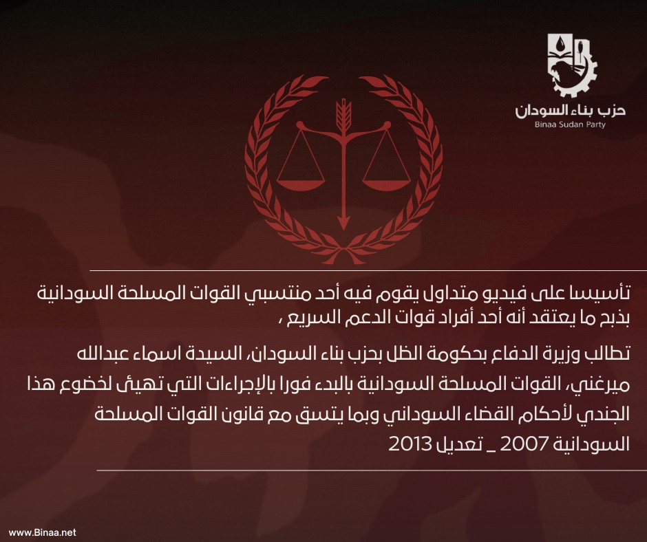 تأسيسا على فيديو متداول يقوم فيه أحد منتسبي القوات المسلحة السودانية بذبح من يعتقد أنه أحد أفراد قوات الدعم السريع، تطالب وزيرة الدفاع بحكومة الظل بحزب بناء السودان، السيدة اسماء عبدالله ميرغني، القوات المسلحة السودانية بالبدء فورا بالإجراءات التي تهيئ لخضوع هذا الجندي