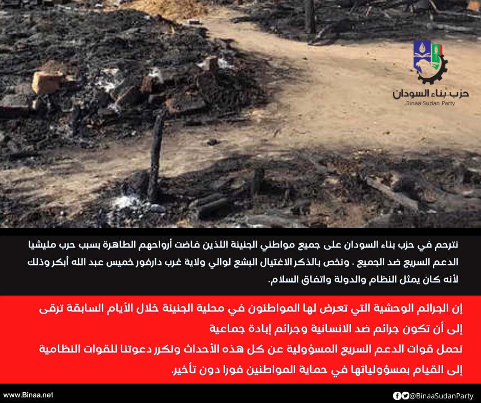 نترحم في حزب بناء السودان على جميع مواطني الجنينة اللذين فاضت أرواحهم الطاهرة بسبب حرب مليشيا الدعم السريع ضد الجميع ،