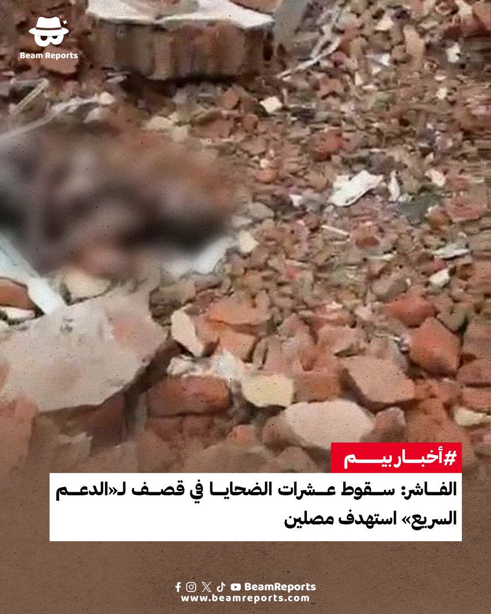 أعلنت مصادر محلية وغرف طوارئ في الفاشر بشمال دارفور، الجمعة، مقتل عشرات المدنيين في قصف بمسيرة استراتيجية تابعة لقوات الدعم السريع استهدف مصلين في مسجد في حي أبوشوك شمال غربي المدينة أثناء أدائهم صلاة الفجر. وأظهر مقطع مصور نشرته غرفة طوارئ أبوشوك جثثًا متفحمة مسجاة على الأرض ودمارًا كبيرًا طال المبنى، وقال أحد المتحدثين في الفيديو إن القصف تم عبر مسيرة استراتيجية تابعة للدعم السريع.