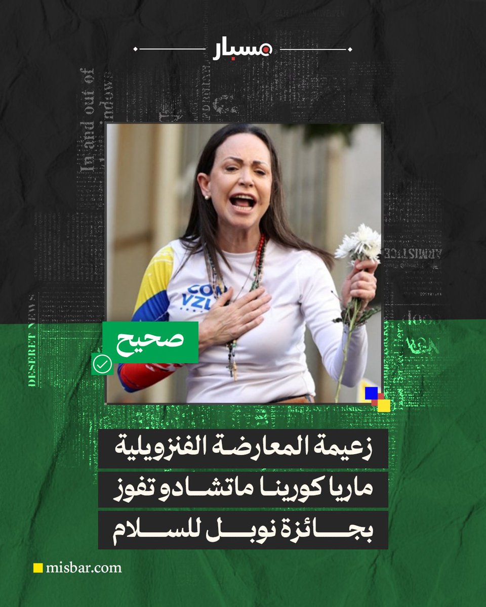 ✅ أعلنت لجنة نوبل النرويجية، اليوم الجمعة، منح جائزة نوبل للسلام لعام 2025 للسياسية الفنزويلية ماريا كورينا ماتشادو، “تقديرًا لجهودها في تعزيز الحقوق الديمقراطية لشعب فنزويلا، ونضالها من أجل تحقيق انتقال عادل وسلمي من الديكتاتورية إلى الديمقراطية.”