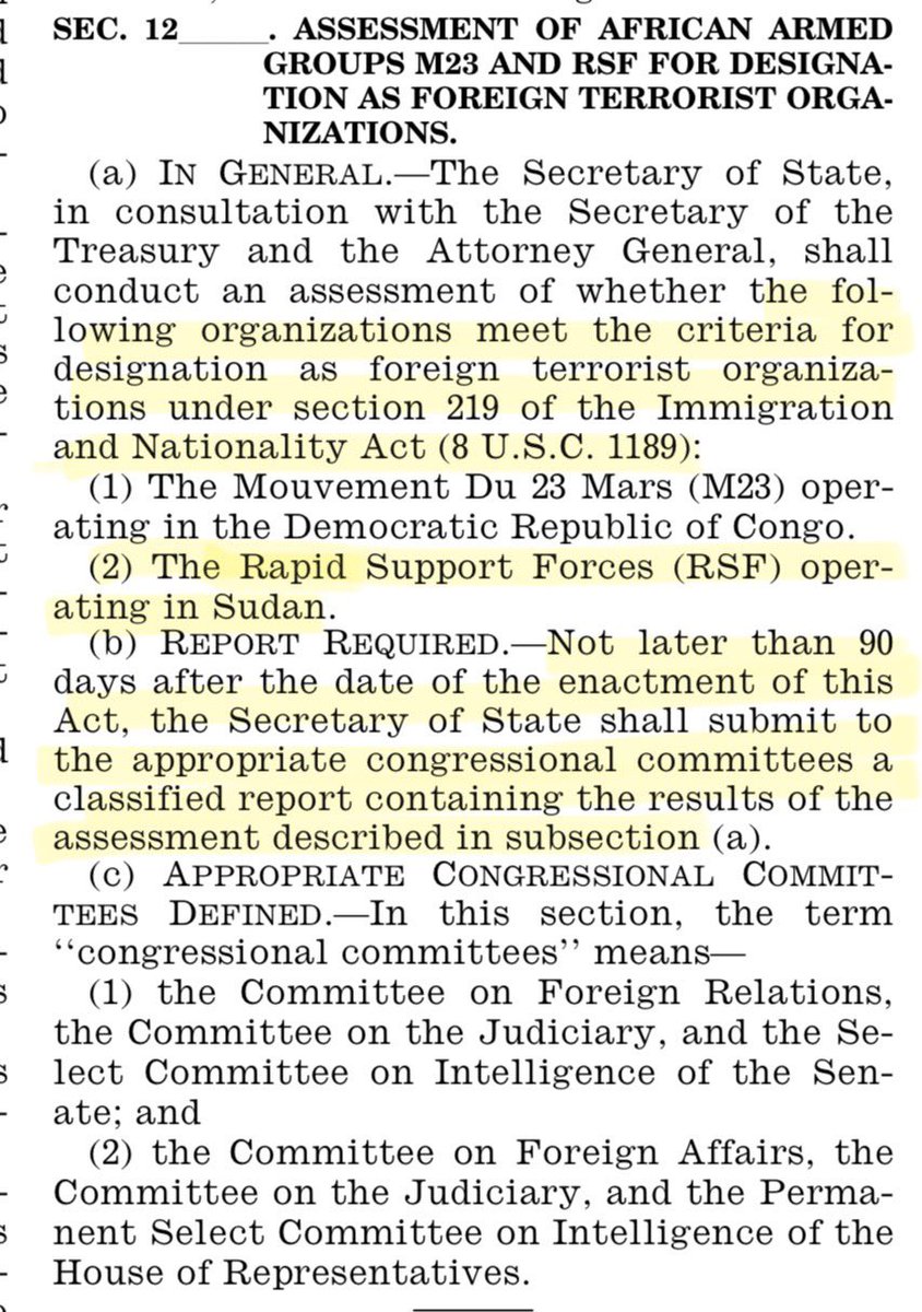🚨 في الموازنة الدفاعية ل٢٠٢٦ التي يتوقع ان يبدأ الشيوخ بالتصويت عليها هذا الأسبوع، بند إضافي طرحه الجمهوري جيم ريش يطالب الخارجية بتقييم ما إذا كانت قوات الدعم السريع #السودان تستوفي المعايير للتصنيف كمنظمة إرهابية أجنبية. يطالب البند وزير الخارجية بتقديم تقرير سري للجان المختصة في الكونغرس بعد ٩٠ يوما” من إقرار المشروع بنتائج التقييم.