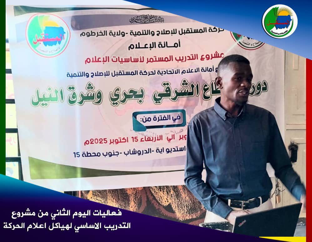 تواصلت لليوم الثاني فعاليات الدورة التدريبية لمنسوبي الإعلام بحركة المستقبل للإصلاح والتنمية بمحلية بحري، والتي تنظمها أمانة الإعلام بولاية الخرطوم في محلية بحري
