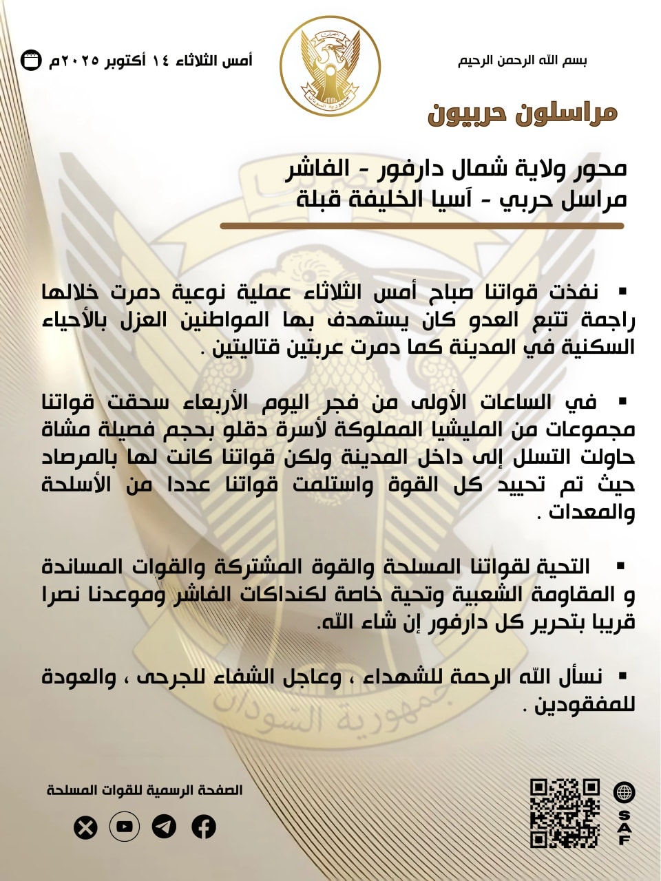 ▪︎ التحية لقواتنا المسلحة والقوة المشتركة والقوات المساندة و المقاومة الشعبية وتحية خاصة لكنداكات الفاشر وموعدنا نصرا قريبا بتحرير كل دارفور إن شاء الله.