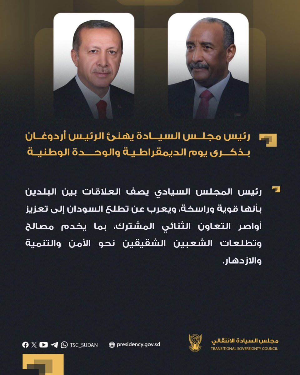 مجلس السيادة رئيس مجلس السيادة يهنئ الرئيس أردوغان بذكرى يوم الديمقراطية والوحدة الوطنية بو… By null Published July 16, 2025 Share SHARE Facebook Twitter Pinterest LinkedIn[ad_1] ⭕️ رئيس مجلس السيادة يهنئ الرئيس أردوغان بذكرى يوم الديمقراطية والوحدة الوطنية بورتسودان ١٤-٧-٢٠٢٥م [ad_2] Source by مجلس السيادة الإنتقالي – السودان Facebook Twitter Pinterest LinkedIn Share This Article Facebook Twitter Email Print Previous Article وآمل أن تساهم هذه الجهود المشتركة في دعم مسيرة السلام والتنمية في السودان. حفظ … Next Article الراهن السياسي و العسكري في السودان … Leave a Comment Leave a Reply Cancel replyYour email address will not be published. Required fields are marked *Comment * Name * Email * Website Save my name, email, and website in this browser for the next time I comment. Δ SearchSearchRecent Postsأكرمنا الله صباح اليوم الأحد بلقاء إخوةٍ كرام، على ضفة النيل الأزرق، حيث شاي الش… أعلن بنك السودان المركزي في منشور إدارة السياسات رقم (2025/15) رفع الاحتكار عن ا… ندوة بعنوان: القانون الدولي والسيادة الوطنية قراءة في موقف السودان من لجنة تقصي … والي نهر النيل تستقبل وزير الموارد البشرية والرعاية الاجتماعية الوزير يشيد بالأ… كامل ادريس: رئيس اللجنة السياسية لمؤسسات الدولة السودانية. Recent CommentsNo comments to show.