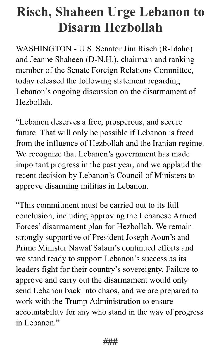 طبعا” الأهم في البيان هو الجزئية الأخيرة فيه : “الفشل في إقرار وتنفيذ نزع السلاح لن يؤدي إلا إلى إعادة #لبنان إلى الفوضى، ونحن على استعداد للعمل مع إدارة #ترمب لضمان محاسبة أي طرف يقف في وجه التقدم في لبنان.”