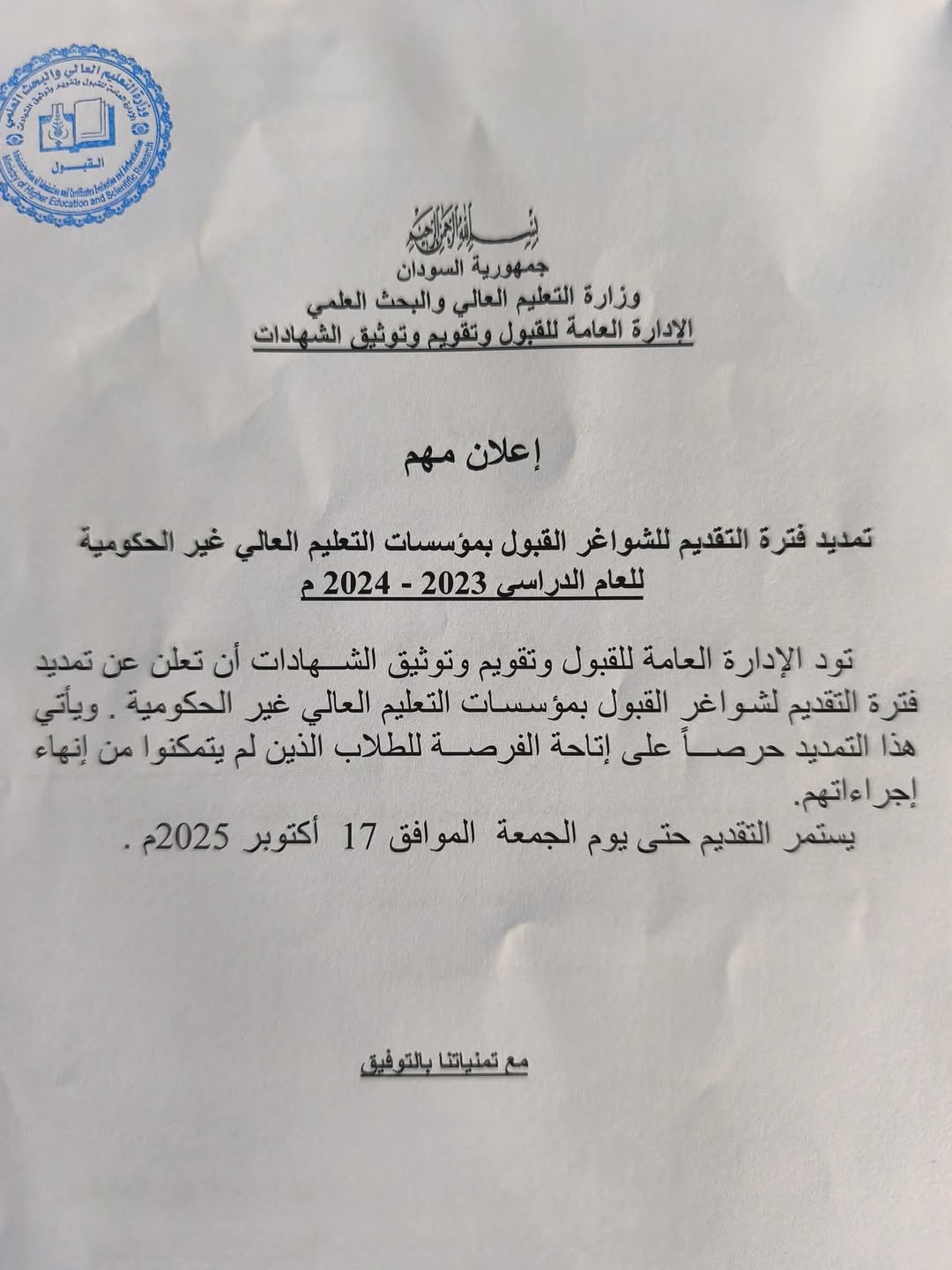 بورتسودان 15-10-2025 (سونا)- في إطار سعيها المستمر لتوسيع الفرص وتمكين الطلاب من الالتحاق بمؤسسات التعليم العالي، أعلنت الإدارة العامة للقبول وتقويم وتوثيق الشهادات بوزارة التعليم العالي والبحث العلمي عن تمديد فترة التقديم لشواغر القبول بمؤسسات التعليم العالي غير الحكومية للعام الدراسي 2023 – 2024م.