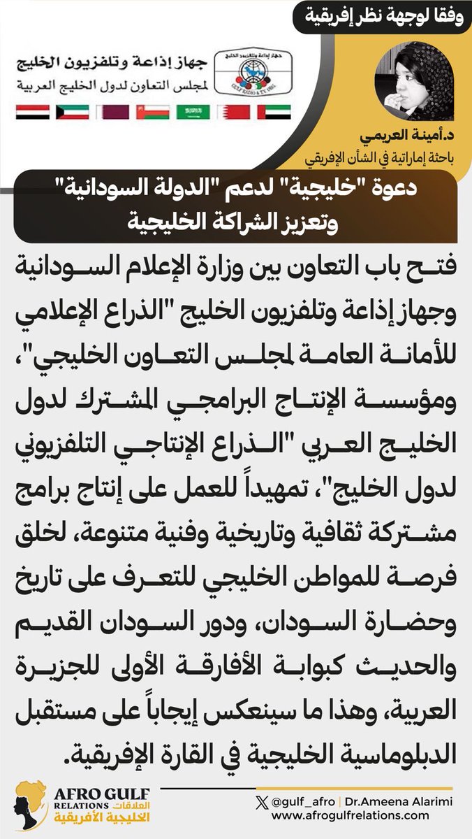 🔆 فتح باب التعاون بين وزارة الإعلام السودانية وجهاز إذاعة وتلفزيون الخليج “الذراع الإعلامي للأمانة العامة لمجلس التعاون”، ومؤسسة الإنتاج البرامجي المشترك لدول الخليج “الذراع الإنتاجي التلفزيوني لدول الخليج”، تمهيداً للعمل على إنتاج برامج مشتركة ثقافية وتاريخيةوفنية متنوعة، لخلق فرصة للمواطن الخليجي للتعرف على تاريخ وحضارة السودان، ودوره القديم والحديث كبوابة الأفارقة الأولى للجزيرة العربية، وهذا ما سينعكس إيجاباً على مستقبل الدبلوماسية الخليجية في #افريقيا ، وهي خطوة ستشكل إضافة حقيقية لمستقبل #العلاقات_الخليجية_الأفريقية وستساهم في إزالة الكثير من المفاهيم الخاطئة حول الحراك الخليجي في القارة الإفريقية. ( طيلة إقامتي الممتدة في الخرطوم لم أجد ما يعلل سبب إبتعاد الدراما والفن والفلكور السوداني عن الشاشة الخليجية، وأتذكر حينها أنني أقنعت نفسي أن خصوصية المجتمع السوداني قد تكون لعبت دوراً في ذلك الإنكفاء الإعلامي الذي أظهر الإعلام السوداني في عين المواطن الخليجي وكأنه يتوارى عن الأنظار، إما لقلة ثقته في نفسه وبما سيقدمه ولا يريد بالتالي إحراجاً يطالبه بتفسير، وإما يتوارى جهلاً بذاته وعدم إدراكه للقيمة التاريخية التي تتميز بها أرض المقرن على سائر محيطها الإقليمي في منطقة وادي النيل، وما بين ذلك الإعتقاد الذي كنت أظنه وما بين إقترابي من النخب السودانية وجدت واقعاً لم أكن أدركه، واقعاً بات لي اليوم مرجعاً أعود إليه قبل الكتابة في الشأن السوداني).