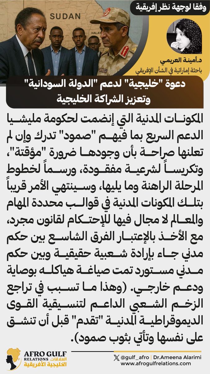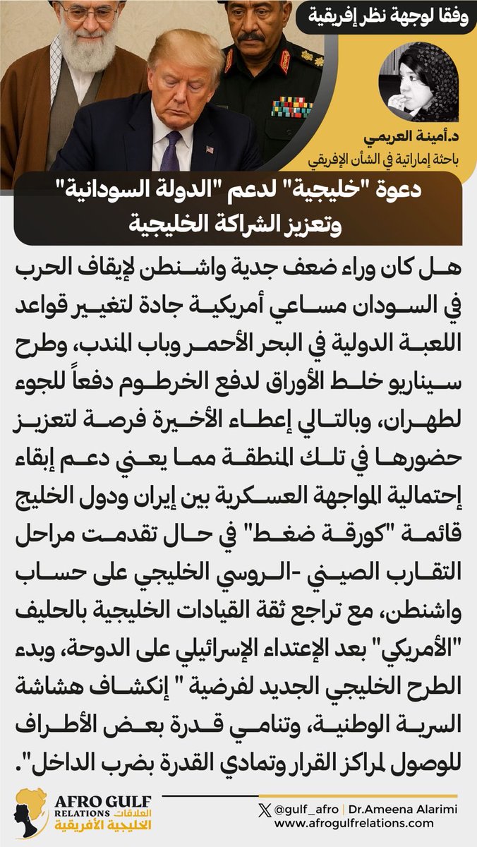 🔆 التأكيد على سيادة #السودان في كافة المنابر ودعم إستقراره وإستقلاله الوطني وسلامة أراضيه ومؤسساته العسكرية والمدنية، ومعالجة كافة المسببات والعوامل الطاعنة في ذلك لقطع الطريق على كافة المغرضين والمؤججين الساعين لإستمرار حالة الإرباك الخليجي المحيطة بالملف السوداني، والمستفيدة منها بعض الأطراف الدولية والإقليمية، ودعم حملة الإستشفاء الوطني التي أعلنت عنها القيادة السودانية، وإيجاد نقاط تلاقي تدعم مسار توحيد الرؤى الخليجية في حل الملف السوداني، والوصول لنقاط تعاون مشتركة لوقف هذه الحرب وإحتواء الأزمة، وفي حال تعذر ذلك ستتحمل دول الخليج جزء من مسؤولية التطورات الأمنية والسياسية القادمة في منطقة #البحر_الأحمر وباب المندب والتي ستمتد لمنطقة القرن الإفريقي وستخلق بلا شك أوضاعاً جيوسياسية جديدة لم تكن في الحسبان.