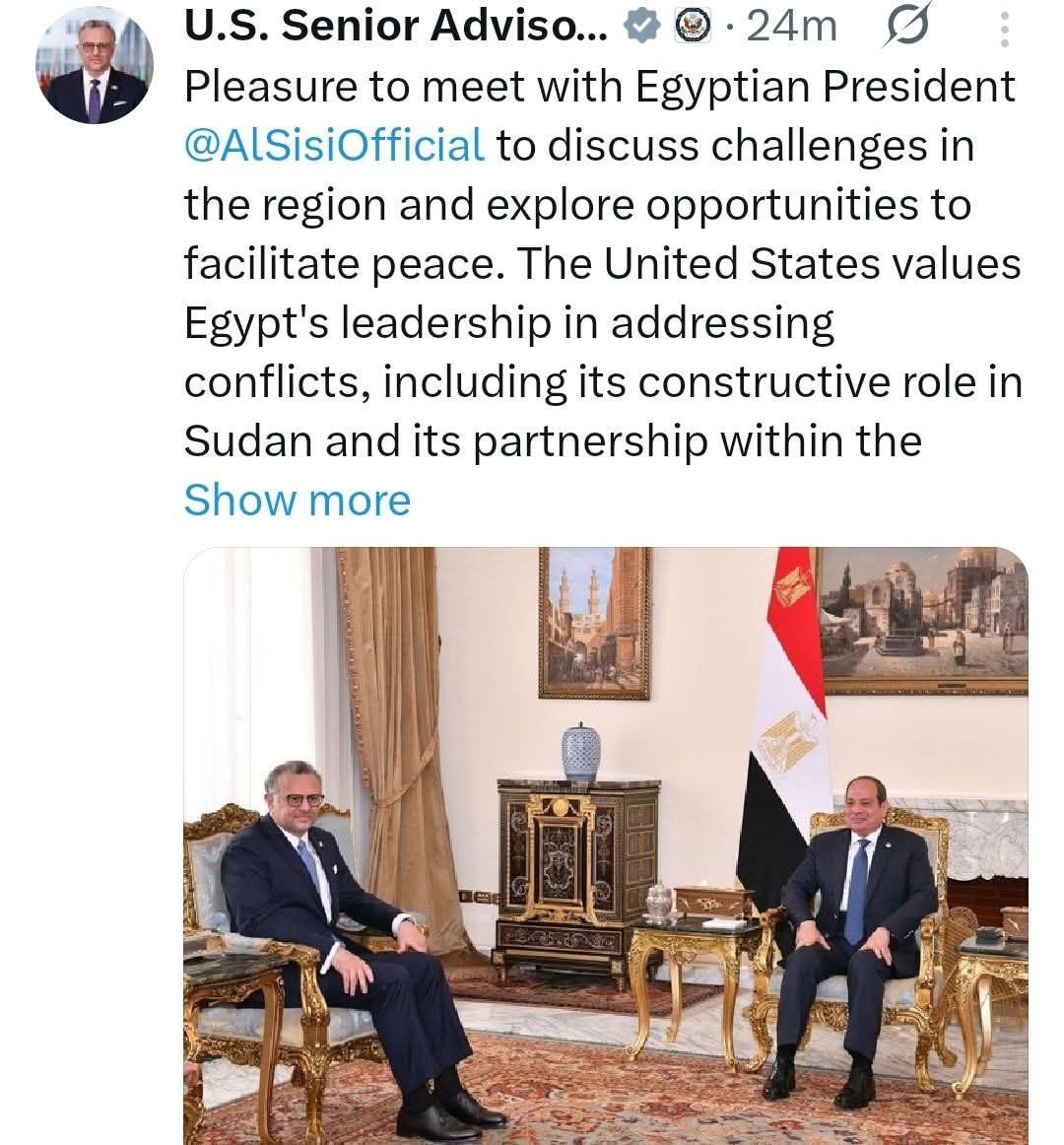 مسعد بولس مستشار الرئيس ترامب يلتقى الرئيس المصري السيسي ويصرح: سُررت بلقاء الرئيس المصري عبد الفتاح السيسي لمناقشة التحديات التي تواجه المنطقة واستكشاف سبل تعزيز السلام. وتُقدّر الولايات المتحدة الدور القيادي لمصر في معالجة النزاعات، بما في ذلك دورها البنّاء في السودان وشراكتها ضمن إطار الرباعية. وقد عبّرتُ عن شكري للرئيس السيسي، وانضممتُ إلى الرئيس الأمريكي في الإشادة باستضافة مصر لقمة السلام التاريخية وتوقيع خطة سلام غزة.