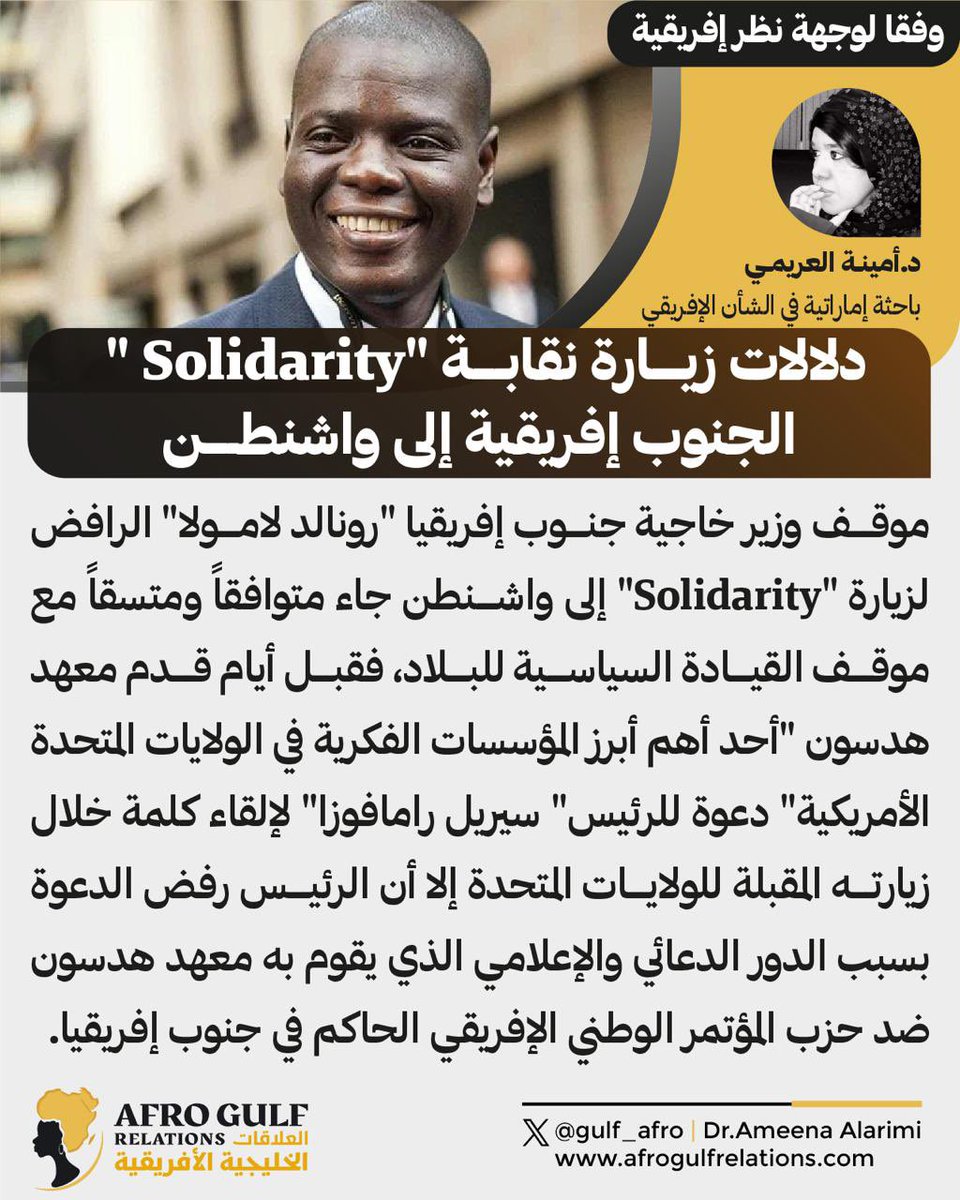2️⃣ موقف وزير خاجية جنوب إفريقيا “رونالد لامولا” الرافض لتلك الزيارة جاء متوافقاً ومتسقاً مع موقف القيادة السياسية للبلاد، فقبل أيام وبالتحديد في 16 من سبتمبر الجاري قدم معهد هدسون “أحد أهم أبرز المؤسسات الفكرية في الولايات المتحدة الأمريكية والتي يعود تأسيسها إلى حقبة الستينيات من القرن الماضي” دعوة لرئيس جنوب إفريقيا ” سيريل رامافوزا” لإلقاء كلمة خلال زيارته المقبلة للولايات المتحدة إلا أن الرئيس رفض الدعوة بسبب الدور الدعائي والإعلامي الذي يقوم به معهد هدسون ضد حزب المؤتمر الوطني الإفريقي الحاكم في جنوب إفريقيا.